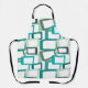 This apron has a mid-century modern design of skewed rectangles with white holes in shades of blue-green.