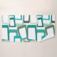 This towel set has a light sea-green washcloth, a darker sea-green hand rowel, and a bath towel with a mid-century modern design of skewed rectangles with white holes in shades of blue-green.