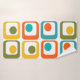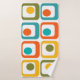 This towel set has an orange washcloth, a yellow hand towel, and a bath towel with a mid-century modern design of four rounded rectangles in four rows with ovals inside them in orange, yellow, green, and turquoise.