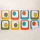 This beach towel has a mid-century modern design of four rounded rectangles in four rows with ovals inside them in orange, yellow, green, and turquoise.