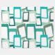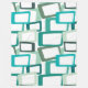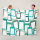 This large fleece blanket has a mid-century modern design of skewed rectangles with white holes in shades of blue-green.