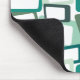 This mouse pad has a mid-century modern design of skewed rectangles with white holes in shades of blue-green.