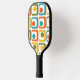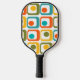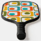 This pickleball paddle has a mid-century modern design of four rounded rectangles in four rows with ovals inside them in orange, yellow, green, and turquoise.