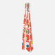 This tie has a design of orange rectangles with circles in them in different shades of green and blue.