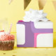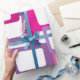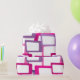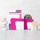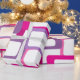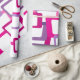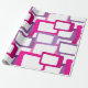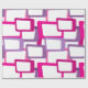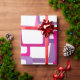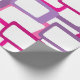 This wrapping paper has a mid-century modern design of skewed rectangles with white holes in shades of pink and shades of purple.