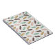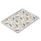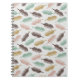 This pattern features a playful arrangement of retro-inspired feathers in pastel colors against a light grey, hand-drawn striped background.