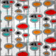 Funky space age ovals fabric with triangles. Colors of bright orange, red, teal and black on a white background. Mid-century inspired fabric design. All graphics by Gail Gabel, LLC.