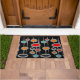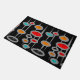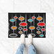 Mid-Century modern spaceage doormat in colours of the time period on a black background.
