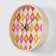 This is elegant Mid century modern starburst on retro harlequin diamonds in orange, red , yellow and pink over beige background . It's great looking clock for your home