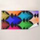 This towel set has a bath towel with a mid-century modern design of retro stars in shades of red, orange, yellow, green, blue, and purple, a light blue washcloth, and a darker blue hand towel.
