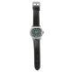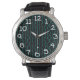 This men's watch has a mid-century modern design of lines with half-rectangles in turquoise on a field of black.