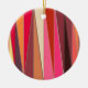 Ornament in a retro modern geometric pattern of elongated triangles, in shades of fuchsia pink, chocolate brown, deep red, tan and orange,accented with mustard yellow and beige