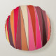 Round pillow in a retro modern geometric pattern of elongated triangles, in shades of fuchsia pink, chocolate brown, deep red, tan and orange,accented with mustard yellow and beige