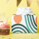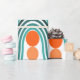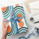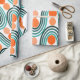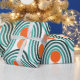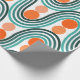 This wrapping paper has a mid-century modern design of teal waves and orange circles.