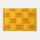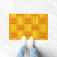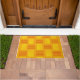 This doormat has a mid-century modern design that looks like a weave with red and yellow lines on a field of gold.