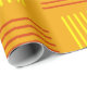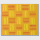 This wrapping paper has a mid-century modern design that looks like a weave with red and yellow lines on a field of gold.
