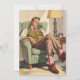 A vibrant, 1950s-inspired illustration of a man lounging comfortably in a green-striped armchair. Dressed in a green vest, white shirt, and red tie, he exudes charm and relaxation, smoking a pipe with a subtle smirk. His pink socks and polished brown shoes add a playful touch to his classic ensemble. The scene is bathed in warm, natural light, complemented by a vintage lamp and a coffee mug on a side table, creating a cosy mid-century modern aesthetic