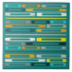 A midmod 1950s vintage style art design has simple geometric shapes of wide rectangles. Multicolored colourful teal green along with orange, yellow and grey.