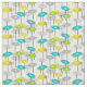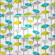 Mid-century modern seed pods design in teal blue, lime green and yellow with grey on a white background. Fabric is mid-century modern era inspired.