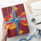 This is elegant classic mid century modern atomic starbursts on geometric abstract circles in orange, tangerine and red on burgundy background