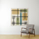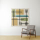 This atomic-age inspired mid century modern design has bold lines and geometric shapes in to appeal to anyone who loves 1950s abstract art. Colours are gold orange, green, turquoise blue, grey.