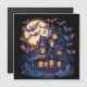 The image depicts a stylised haunted house at night. The house is tall with pointed roofs and several windows emitting a yellow glow, suggesting interior light. Surrounding the house are numerous bats in flight against a dark sky. In the foreground, there’s a graveyard with tombstones, adding to the eerie atmosphere of the scene. This image is interesting due to its thematic elements commonly associated with horror or Halloween and its vibrant yet dark colour palette which sets a spooky mood.