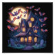 The image depicts a stylised haunted house at night. The house is tall with pointed roofs and several windows emitting a yellow glow, suggesting interior light. Surrounding the house are numerous bats in flight against a dark sky. In the foreground, there’s a graveyard with tombstones, adding to the eerie atmosphere of the scene. This image is interesting due to its thematic elements commonly associated with horror or Halloween and its vibrant yet dark colour palette which sets a spooky mood.