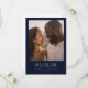 This is a warm and intimate style image featuring a loving couple sharing a joyful moment, bathed in the soft golden light of sunset. The composition captures their genuine smiles and close connection, set against a blurred natural backdrop that adds to the romantic ambiance. The colors are rich yet soothing, with deep navy framing the photo, complementing the earthy tones within. It's perfect for announcing a special day or celebrating love, evoking feelings of happiness and warmth.