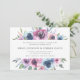 Elegant floral wedding invitations displaying your wedding details framed by a top and bottom border of purple, mauve & blue watercolor flowers with lush green leaves. The back features a solid dark blue background. Designed to coordinate with our Midnight Blooms wedding collection.