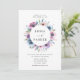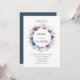 Elegant floral wedding invitations displaying your names encircled by a framed by a top and bottom border of purple, mauve & blue watercolor flowers with lush green leaves. Personalize the purple and blue floral invitations by adding your wedding details below. The back features a solid dark blue background. Designed to coordinate with our Midnight Blooms wedding collection.