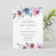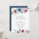 Elegant floral wedding invitations displaying your wedding details framed by a top and bottom border of purple, mauve & blue watercolor flowers with lush green leaves. The back features a solid dark blue background. Designed to coordinate with our Midnight Blooms wedding collection.