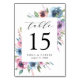 Elegant floral table number cards featuring your wedding details framed by purple, mauve & blue watercolor flowers with lush green leaves. The design repeats on the back. Designed to coordinate with our Midnight Blooms wedding collection.