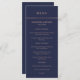 This modern and elegant wedding menu features rose coloured text on a midnight blue background, with a faux rose gold stripe at the top.