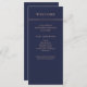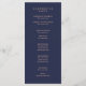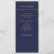 This modern and elegant wedding program features rose coloured text on a midnight blue background, with a faux rose gold stripe at the top.