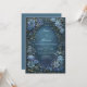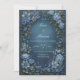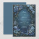 Immerse your guests in a world of midnight elegance with this breathtakingly atmospheric botanical composition. The design features a deep, moody navy blue background with a painterly texture that provides a rich foundation for the shimmering floral border. Large, star-shaped clematis blossom petals in shades of dusty blue and teal anchor the corners, while delicate sprays of tiny periwinkle bloom clusters and bronzed leaf motifs trail elegantly along the edges. A classic double-line gold frame adds a touch of royal sophistication to the ornate layout. This wedding invitation is a premier choice for a formal evening ceremony, a winter gala celebration, or a moody Victorian-inspired event. It ensures your event details are presented with high-end artistic drama and natural grace from the moment the envelope is opened.