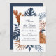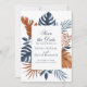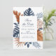The front of the card showcases the beautifully arranged midnight blue monstera leaves, palm leaves, and tropical foliage, elegantly placed beneath the white brick-like pattern. The script and elegant midnight blue font pair perfectly, adding a touch of sophistication and personalisation. Customise the card with your unique details to make it truly yours.