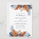 The front of the invitation features a captivating display of midnight blue monstera leaves, tropical foliage, and rustic brown dried palm leaves. The combination of these elements adds a touch of tropical flair to your special day. The personalised text is elegantly presented in midnight blue script and minimalistic font, lending a sense of sophistication and style to the design.