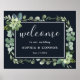 This wedding welcome sign features painted watercolor succulent, eucalyptus, and botanical green leaves with a rectangle frame on a midnight navy blue background. Matching items are also available.