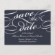 Elegant save the date postcards in rich midnight blue and white feature embellished calligraphy script lettering for a classic, formal look. Personalize the reverse side with your wedding details, including names, date, location, and additional information like your wedding website. Space provided for your pre-printed return address.