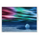 In the bay of a frozen land a great iceberg floats in the cold blue sea. Snowflakes and stars speckle the scene, and in the sky overhead the aurora glows in shades of pink, lavender, green, and blue.