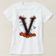 This is a vivid Halloween illustration featuring a giant, dark, tree-like letter 'V' covered in orange leaves, dramatically silhouetted against a huge full moon. It is surrounded by a group of glowing jack-o'-lanterns and flying bats in a spooky, moonlit forest setting.
