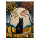 This whimsical and serene artwork features a striking black cat as the central figure, sitting poised and majestic in a stylized, autumnal landscape. Behind the cat, a massive, luminous full moon dominates the scene, casting a gentle glow over rolling hills and a dark, starry sky. The surrounding trees are adorned with vibrant, stylized leaves in a warm palette of yellow, gold, and burnt orange, contrasting beautifully with the cool tones of the background. The piece blends a sense of magical realism with a folk art esthetic, creating a captivating and tranquil scene filled with mystical charm.