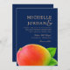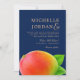 A stand out wedding invitation featuring a vibrant summer mango against a midnight blue backdrop. The back reverse side of the invitation features a blue and white stripe pattern to complement the front. Words of goldish accent make up the text. All elements of this invitation or unlocked customisable so enjoyed being creative.