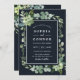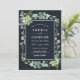 This wedding invitation features painted watercolor succulent, eucalyptus, and botanical green leaves with a rectangle frame on a midnight navy blue background. Matching items are also available.