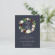 Elegant watercolor floral save the date postcards feature "save the date" in chic calligraphy inside a wreath of watercolor flowers in burgundy marsala and blush pink with lush green leaves and foliage. White lettering on a rich navy blue background adds dramatic elegance to this beautiful floral save the date postcard.