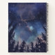 This bohemian notebook features a custom script name and monogram, and a watercolor midnight sky above the forest.