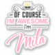 Of Course I'm Awesome I'm Mila in mixed black and pink sans and cursive font lettering with white scroll embellishments and topped a golden crown.