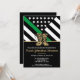 This design features a military flag with black and white stripes, and a thin green line stripe as well. The army boots and gold text sits above all of the party details for the graduating sergeant, captain, soldier, lieutenant or general's graduation party details.