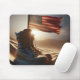 A pair of rugged combat boots stands upright in the sand with an American flag inserted in one of them fluttering in the breeze