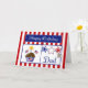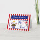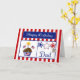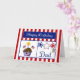 This Patriotic Birthday Card will make your military dad smile. It features a red and white striped background, chocolate cupcake with stars, American Flags, a flag heart and a candle, red, white & blue stars, a dog tag embossed with "USA" and a blue banner with the text "Happy Birthday" in white. ©2015 Dog Tags & Combat Boots Military Cards by Sherry Harris